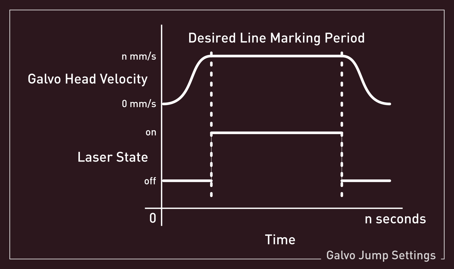 When attempting to mark, the physical mirrors of the galvo head must reach the desired speed before they begin marking. This fine tuning allows the user to reduce the burn-in potential during that initial acceleration by adjusting the source timing.