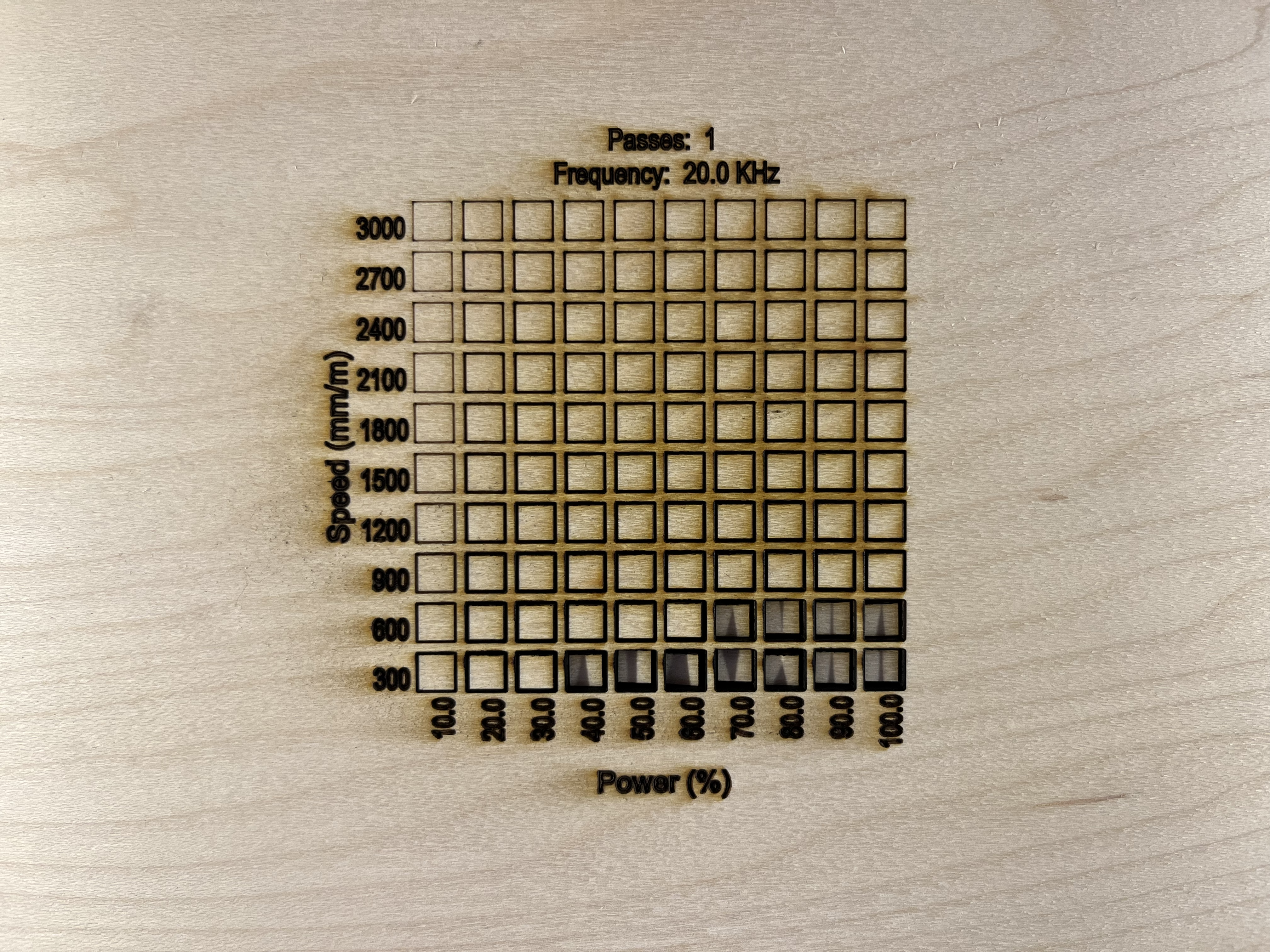 When it's finished, examine the results. You're looking for the box that cuts through the most cleanly, without charring. If several cut through with similar amounts (or lack of) charring, you can select the one that achieved a clean cut at the fastest speed.