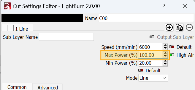 Click Edit Material Setting in the lower left to open the Cut Settings Editor, and set the Max Power to 100.0%.