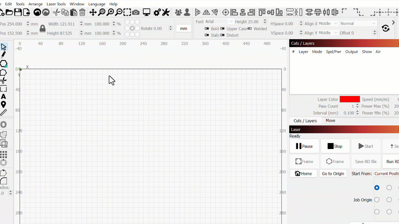 The output location of the test grid in your laser's work area is determined by the Start From mode you select before opening the Material Test Generator window. If you choose Absolute Coords, you'll have additional controls within the Material Test Generator window, but we'll be using Current Position in this guide.