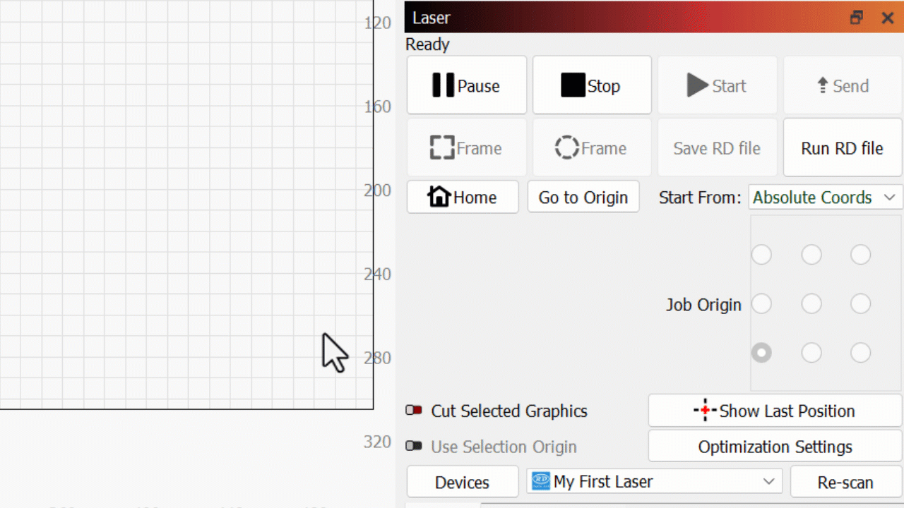 - In the Start From drop down menu in the Laser Window, select Current Position.