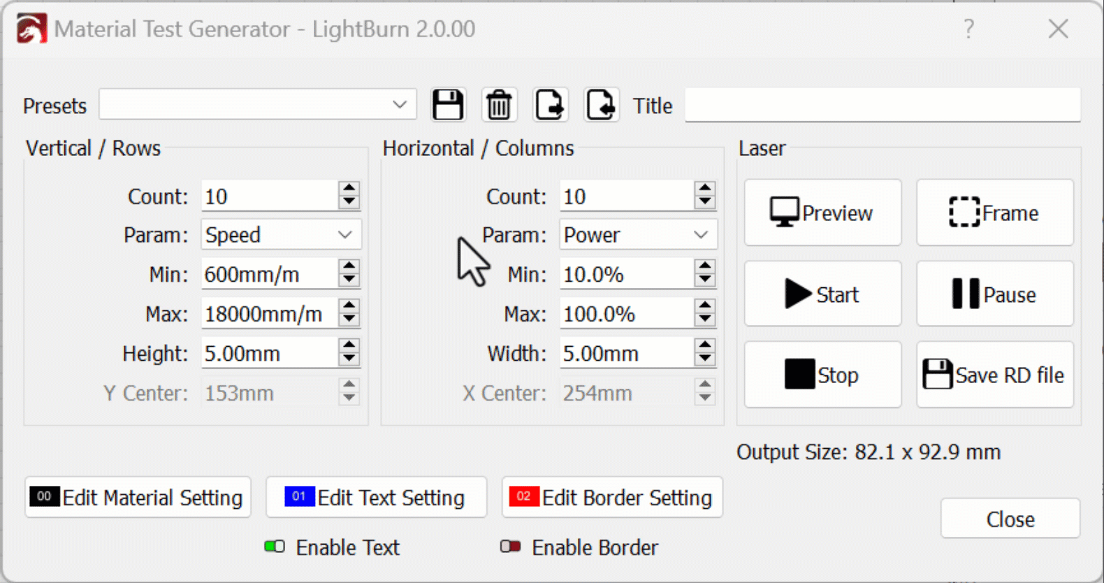 LightBurn will automatically populate the Material Test fields with a range of values that should provide a good starting point for almost all lasers of your selected type.
