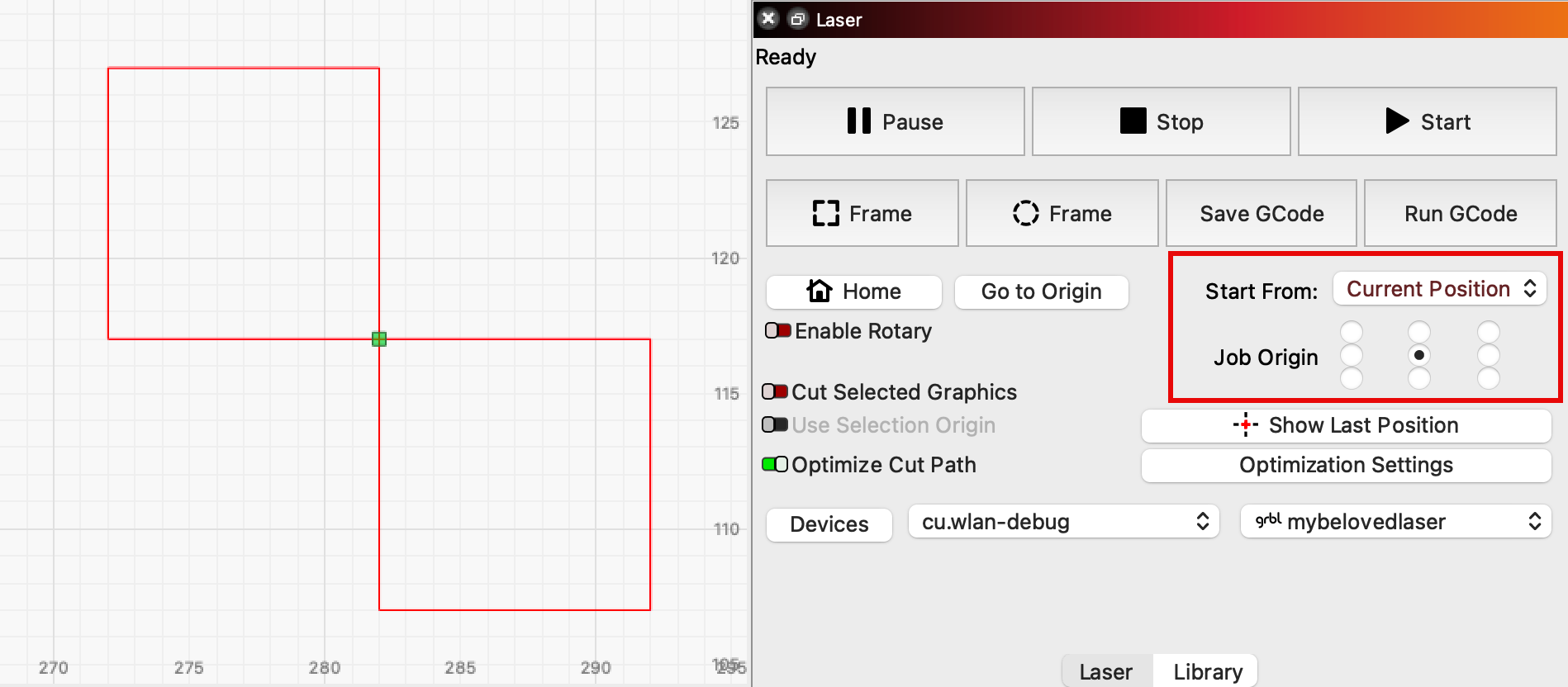 When you run your project, the location of the laser head will shift to match the location of the red dot when you performed one of the above actions.