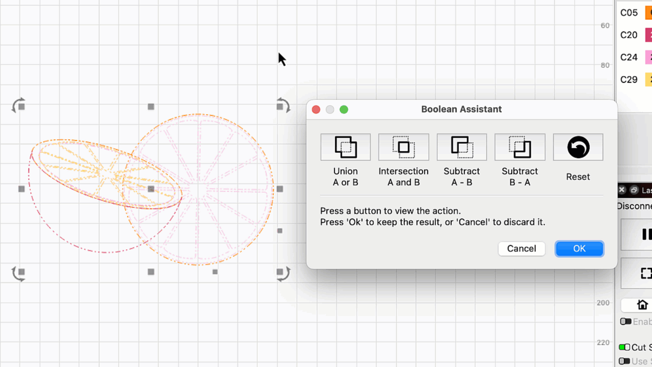 The Boolean Assistant is a dialog window that shows a preview of what each of the Boolean operations will do to your selected shapes, and gives you the option to click OK to confirm the change, or Cancel to discard it and close the Boolean Assistant.
