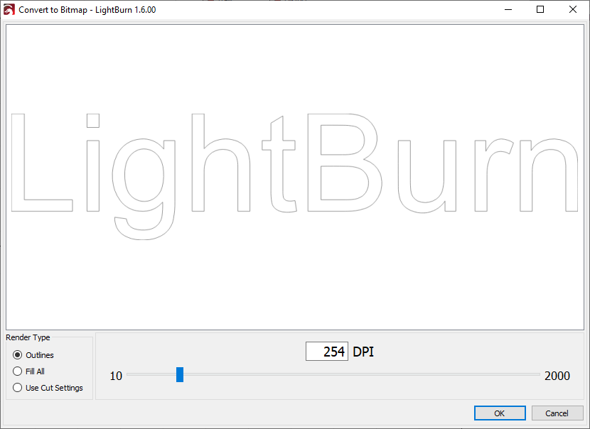 • The Render Type option determines whether the resulting bitmap will show just the Outlines of the vector graphics, will Fill All areas between the outlines, or Use Cut Settings to determine whether to render outlines or solid fills depending on whether the graphics are assigned to a layer set to Line Mode.