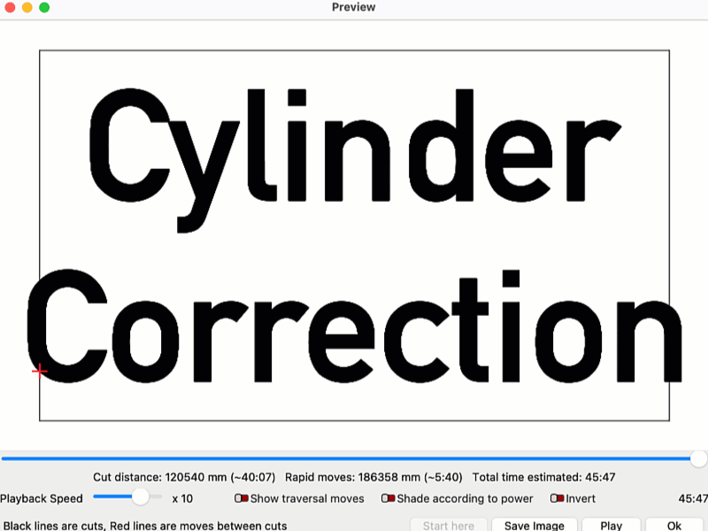 LightBurn will calculate the Cylinder Correction assuming the design to be output is centered on the object. If you are unable to place the item you're engraving at the center of the laser's working area, move your design to match the actual location of the object.