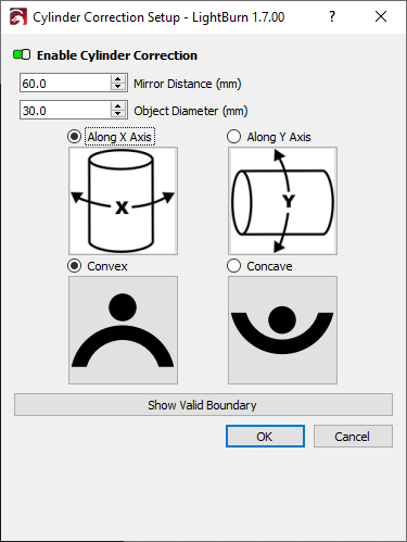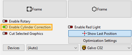 If Show cylinder correction enable in main window is enabled in your Settings/Preferences, you can also enable or disable Cylinder Correction Mode using the switch in the Laser Window.