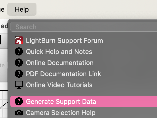 Generate Support Data creates a block of encoded characters that LightBurn Support staff can use to view information on your LightBurn Preferences, Device Settings, and other important installation information.