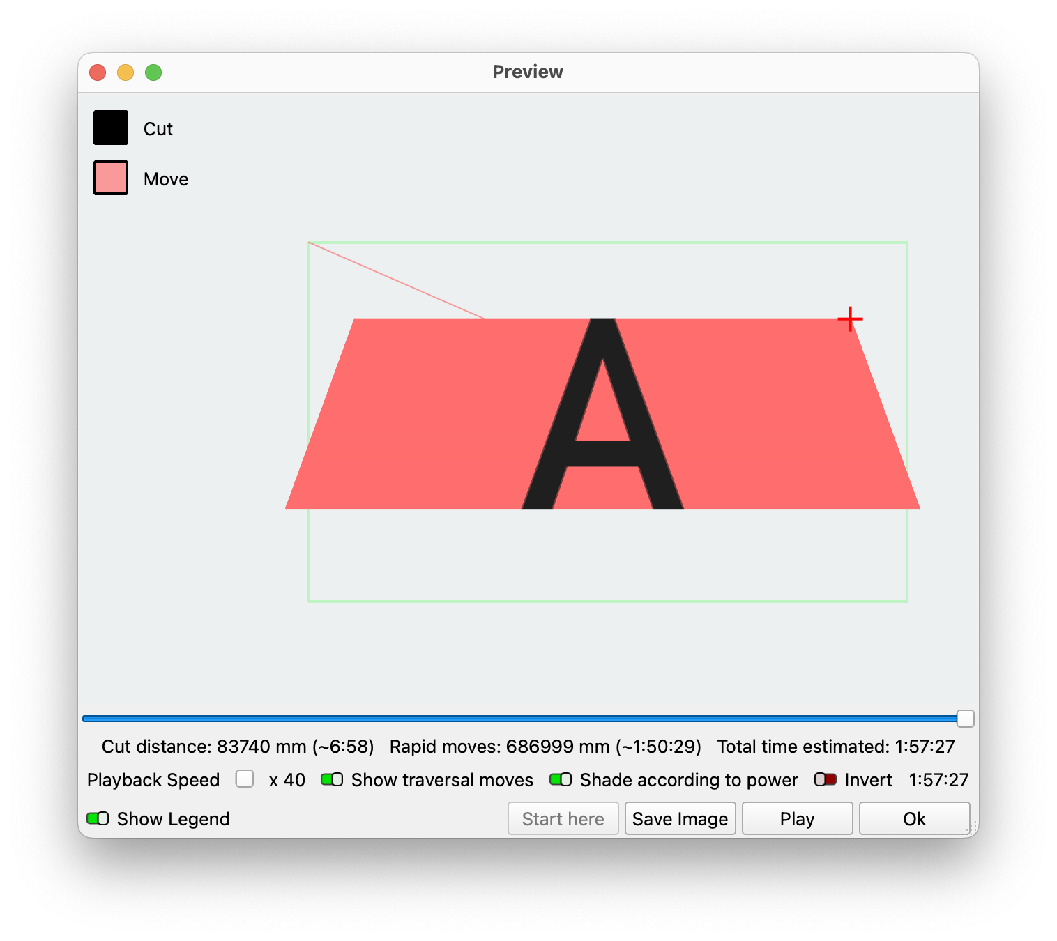Red lines depicting traversal moves show the laser traveling a significant distance past the edges of graphics, or beyond the edge of the laser's work area, depicted as a green square/rectangle.