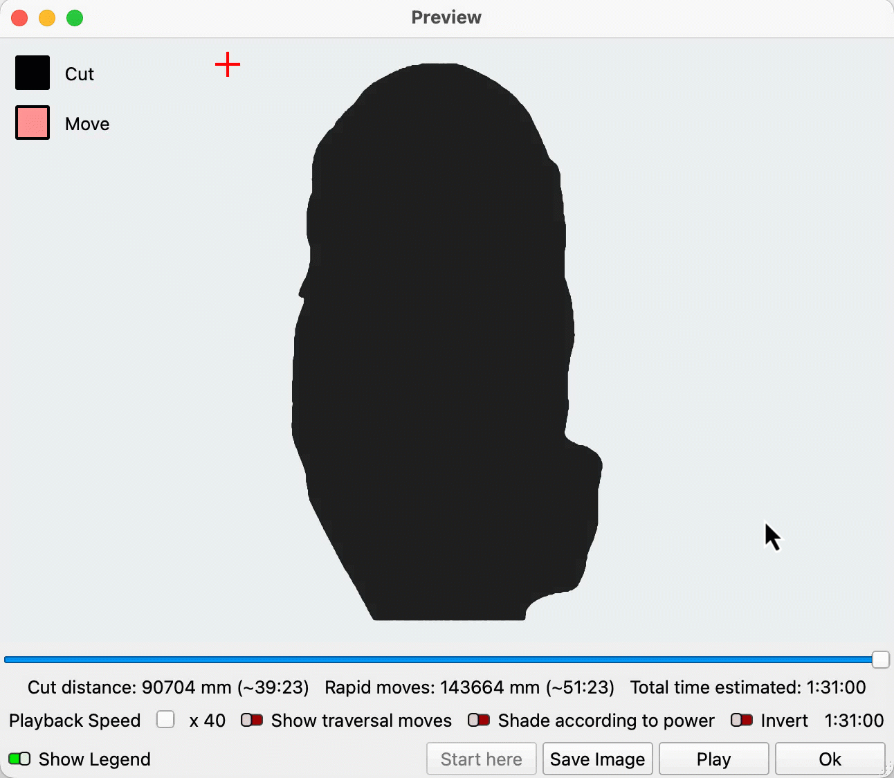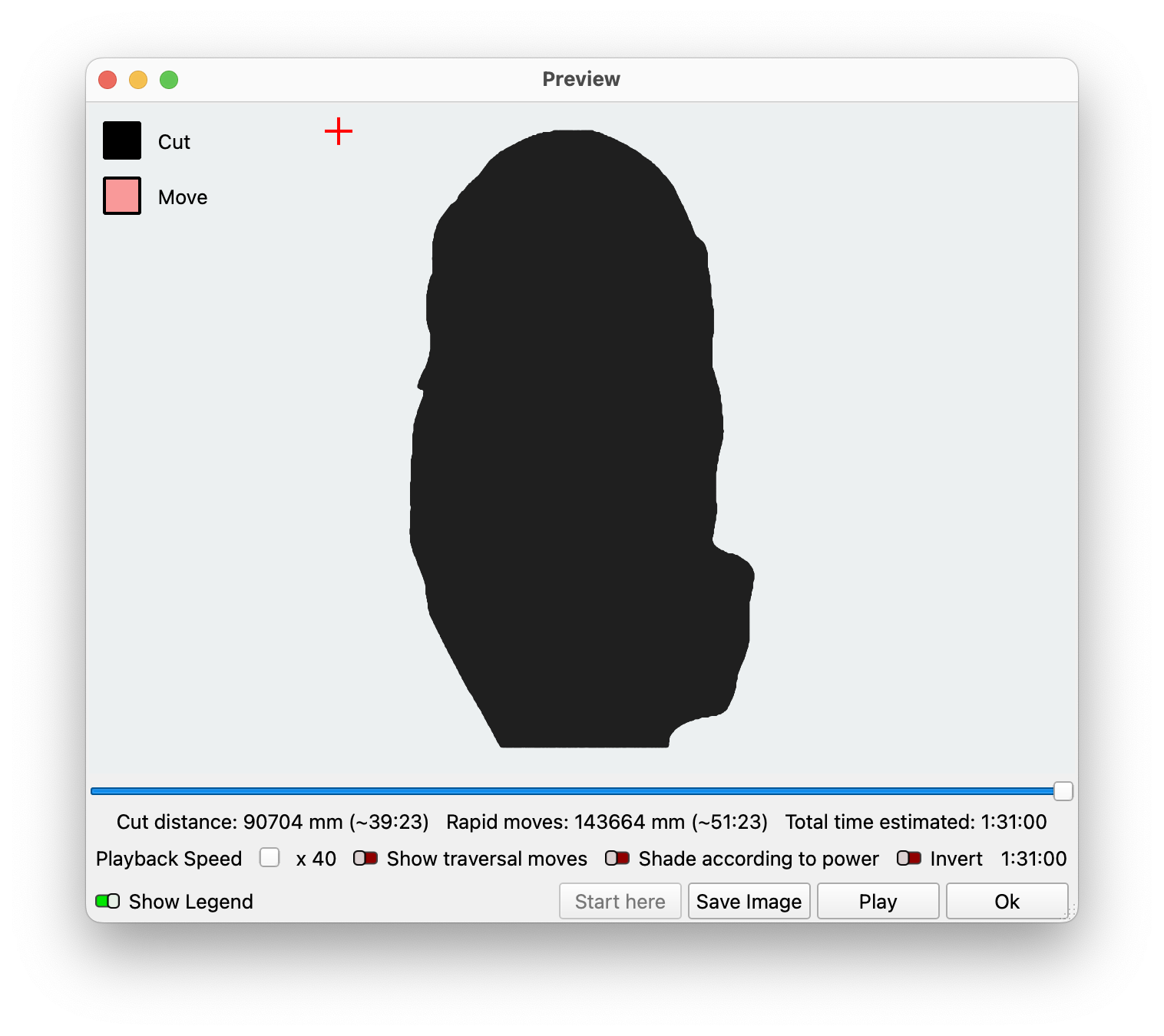 When set up properly, with Show traversal moves enabled you should see the red areas of the Preview expand with each pass, as the laser travels over rather than engraving progressively larger (and lighter) areas of the image.
